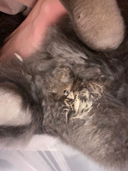 If there is matted fur or dried debris, it can be removed with small round-tipped scissors, cutting only the fur and taking great care not to injure the skin or the genitals. Never use pointed scissors.