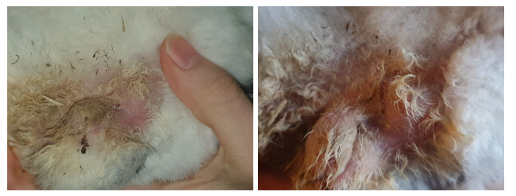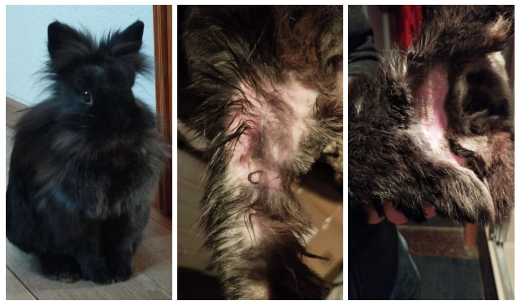If the skin shows flaking, white or yellowish plaques, hair loss, redness, or inflamed areas, this indicates a skin condition. Rabbit skin is very sensitive and can deteriorate quickly.
